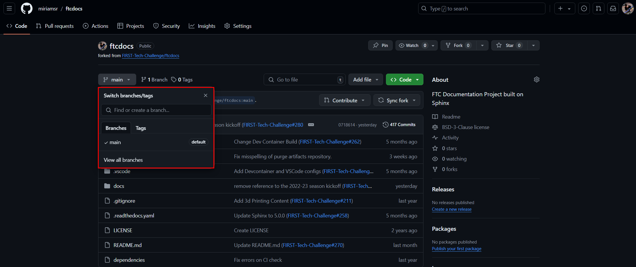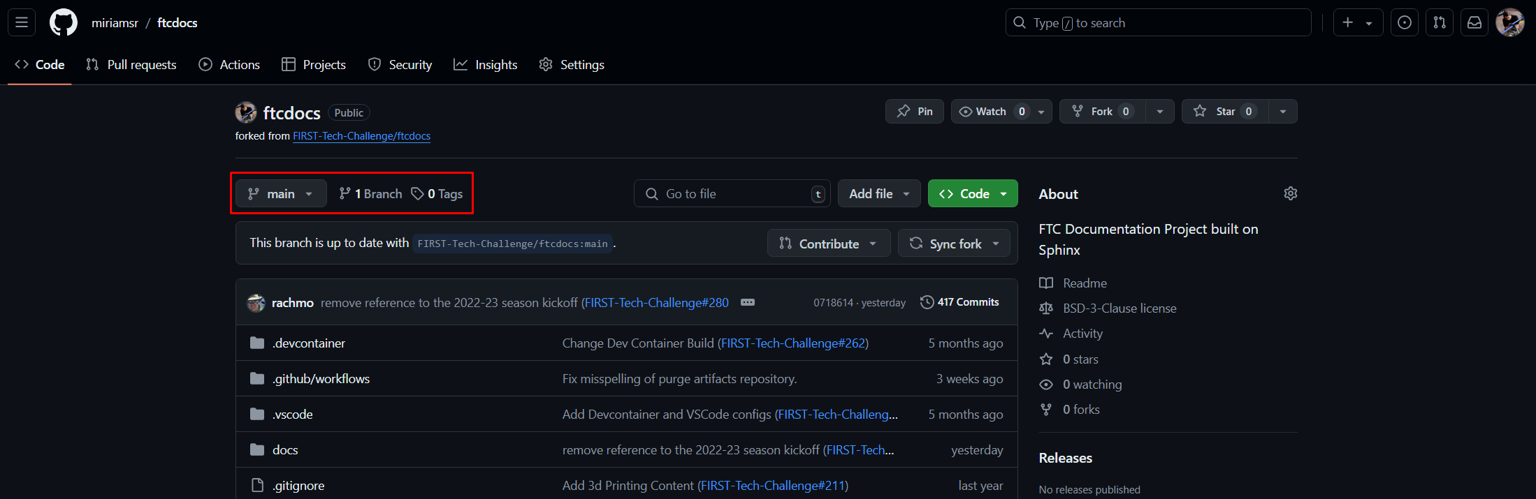 the branch we’re currently viewing is the main branch, and there is only one