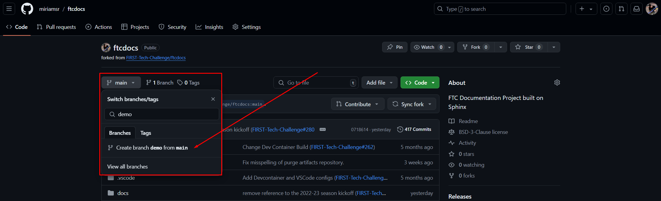 Here we can see, circled in red, the Branch information for the repo. We can see that