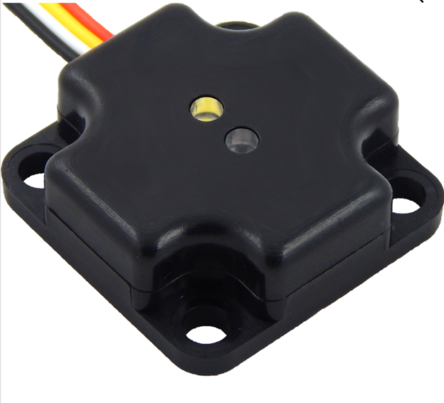An Optical Time of Flight (ToF) Sensor is a device that is able to measure the distance between an object and the sensor. It does this by sending out a light beam and measuring the time it takes for the beam to travel to the object and back. Using this time and the known speed of light the distance can be calculated. Be aware that the way the object in question interacts with light can change the accuracy of the distance measurement. A transparent object like field panels will often provide inaccurate measurements.