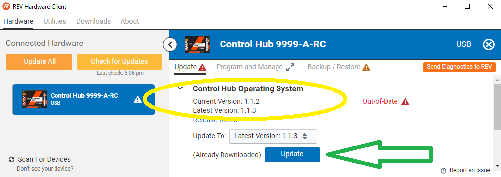 Confirm the Latest Version in the drop-down menu, then click the blue “Update” rectangle (green arrow, above). The speed of this update is improved, since in Updating the REV Hardware Client the required update file was previously downloaded.