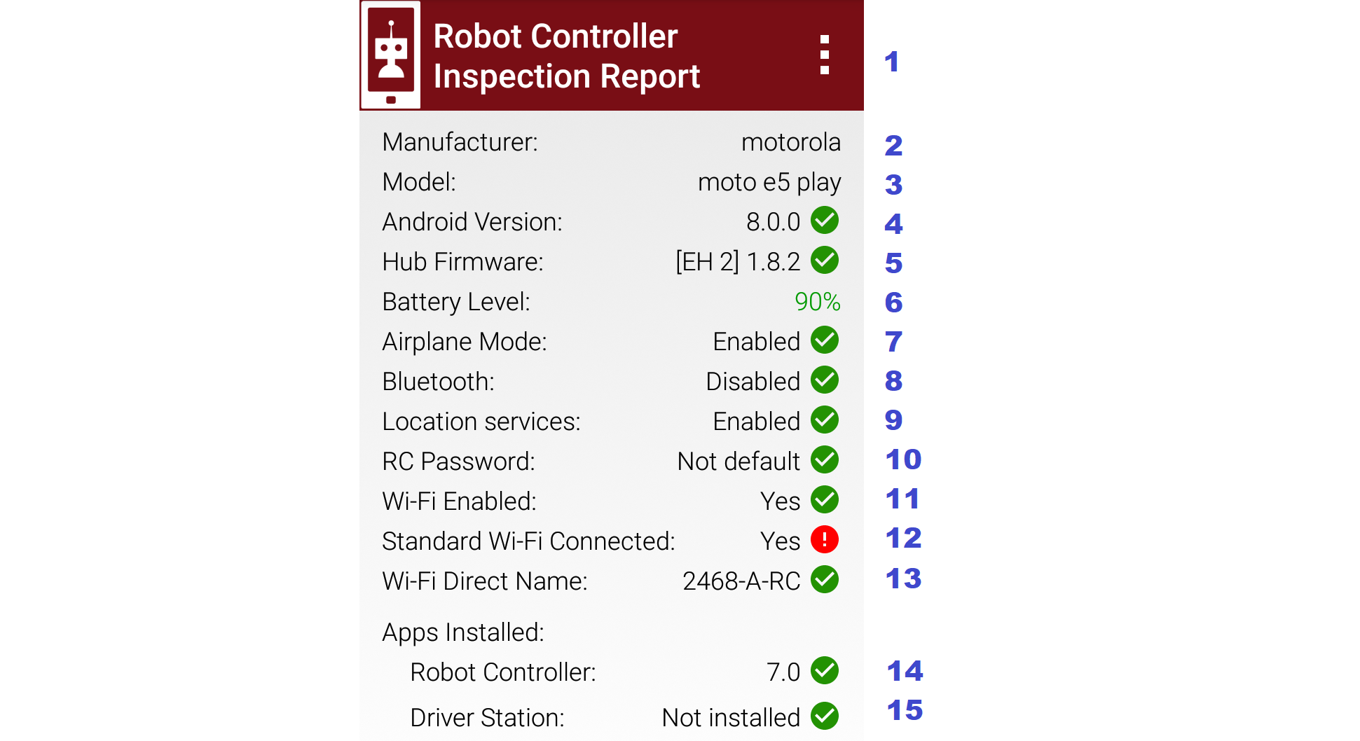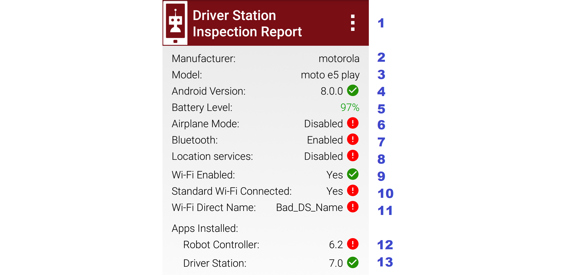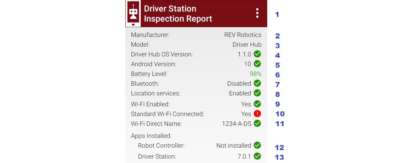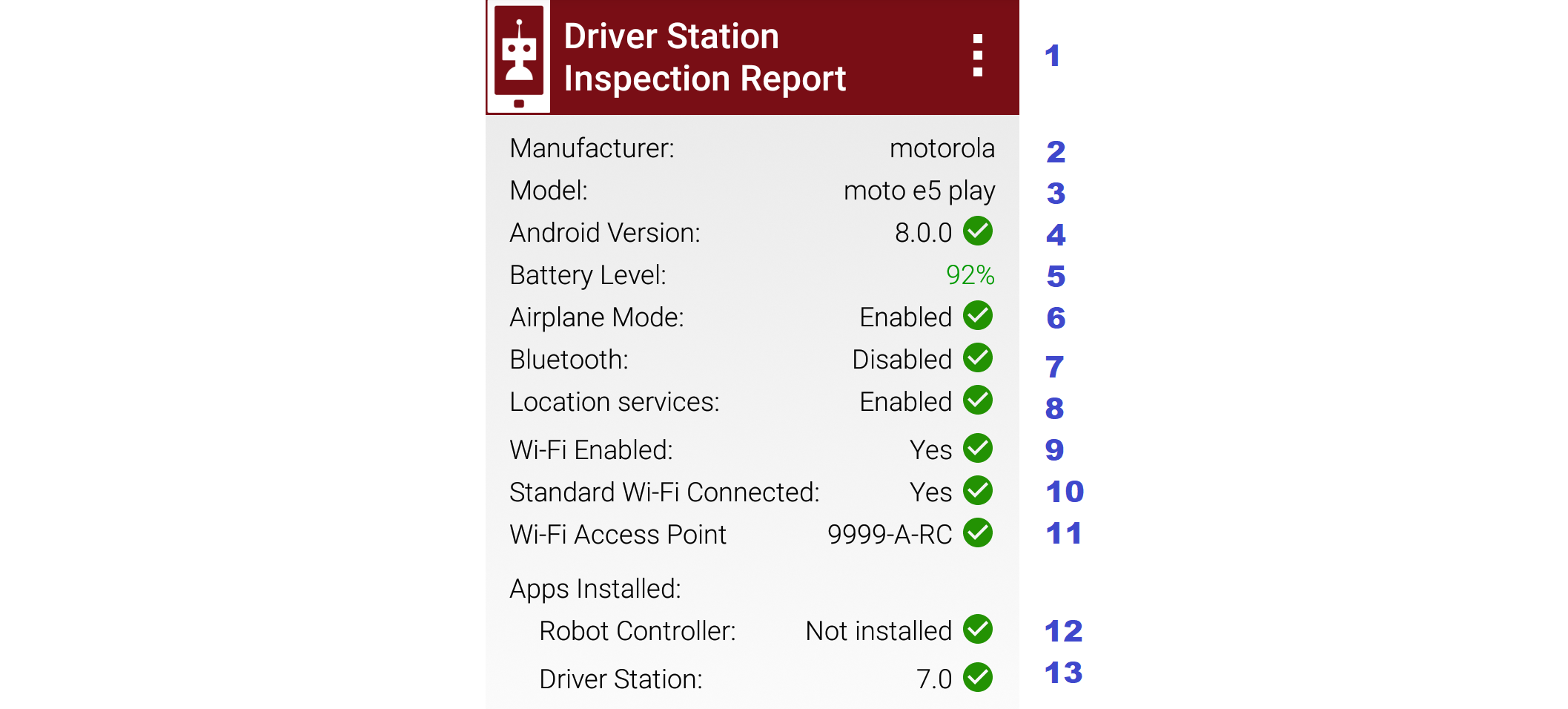 Item 13 ensures the DS app meets the minimum version for the current FTC season, based on the device’s system date. This particular version 7.0.1 does not exactly match the RC phone’s 7.0. Such a “Point mismatch” is allowed under updated FTC rules (was Q&A #176 for 2021-2022 season). Otherwise, an “incorrect” red mark here can be cleared by correcting the date in the Android device Settings.