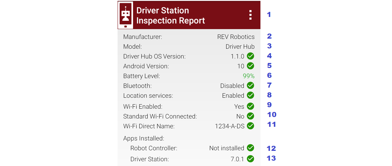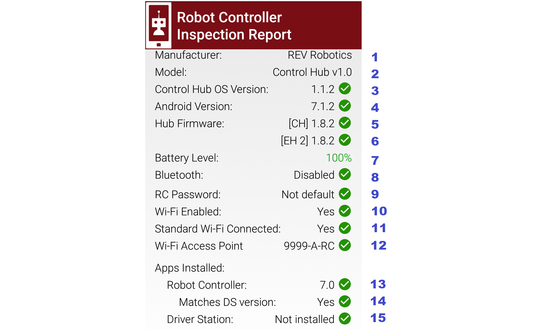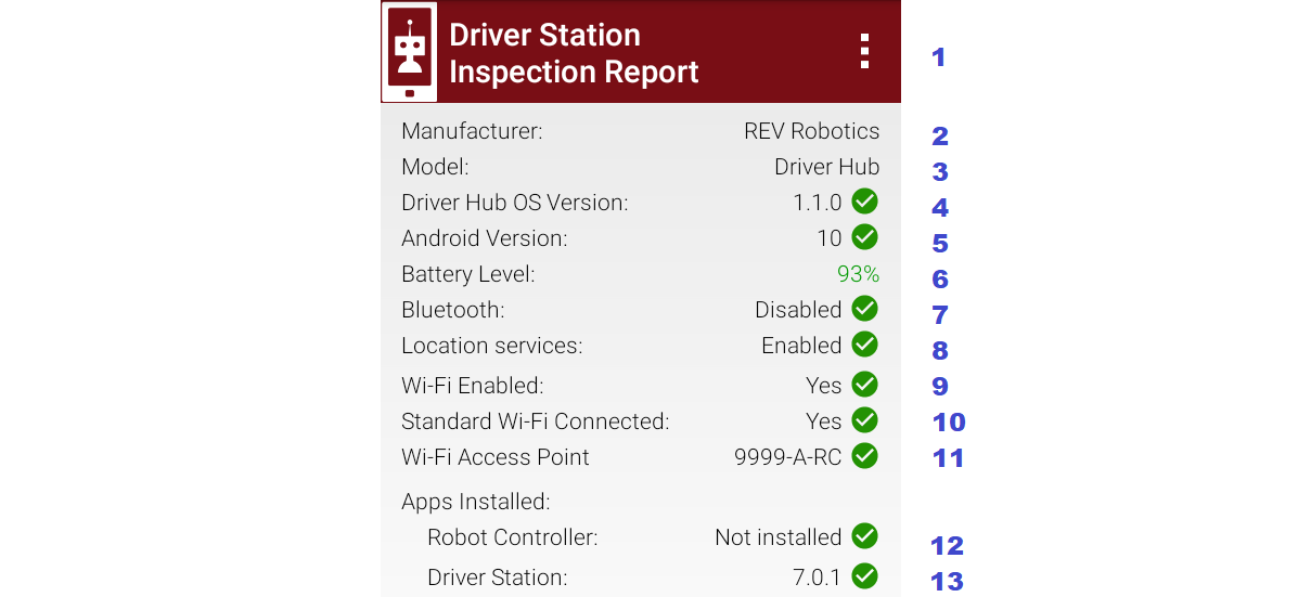 Item 11 shows the Standard Wi-Fi network name, or Access Point (AP), that the Driver Hub is connected to. The check-mark indicates the AP is an FTC legal device (Control Hub) and has a correctly formatted name. This does not check that the DS and RC names match (team number). In fact, this Driver Hub is 1234-A-DS and this Control Hub is 9999-A-RC, an illegal combination to be flagged by the FTC team or the Robot Inspector.