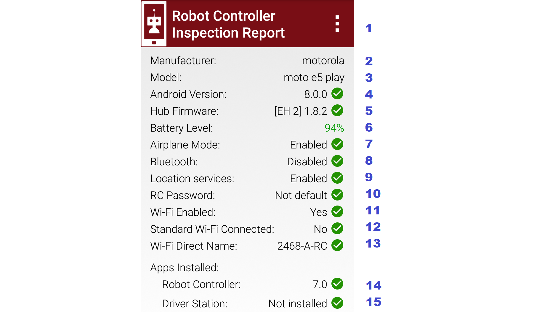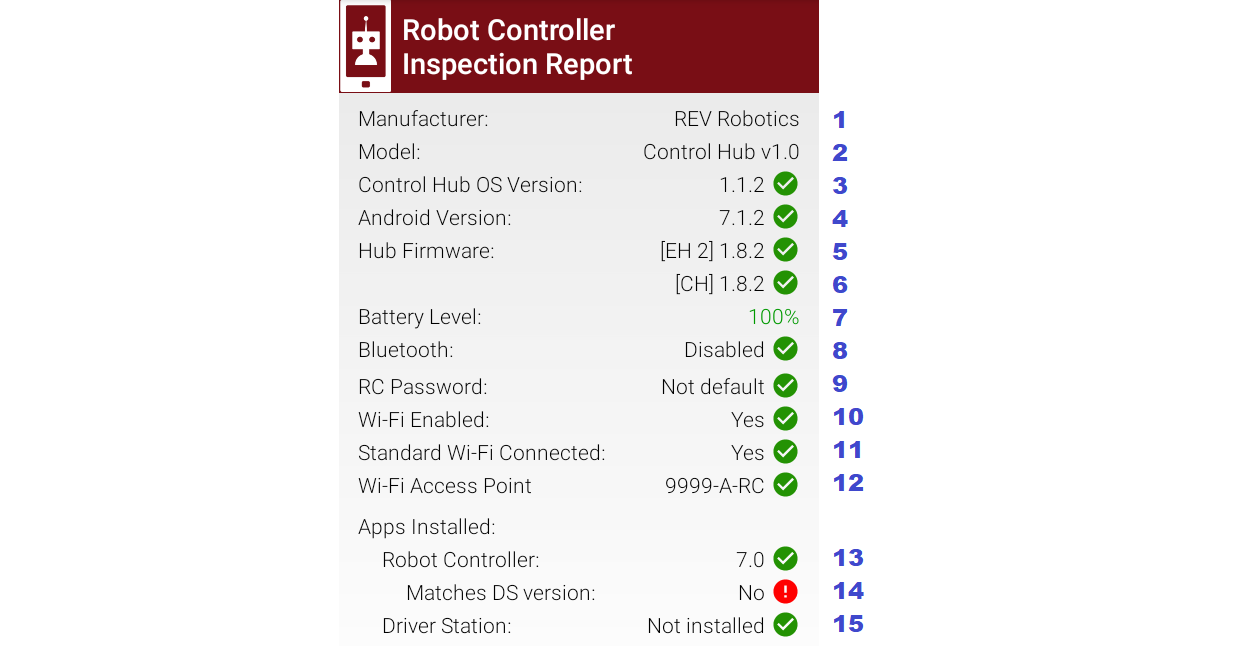 RC Passwordappears only in RC Self Inspect, not in DS Self Inspect. It checks the FTC requirement for a Control Hub password different than the factory default (“password”). Although aimed only at the Control Hub, this item does appear on RC phones (as here) which don’t have a default password and thus always get the check-mark.Item 14 ensures the RC app meets the minimum version for the current FTC season, based on the device’s system date. It does not check for a match with the DS app version. An “incorrect” red mark here can be cleared by correcting the date in the Android device Settings.