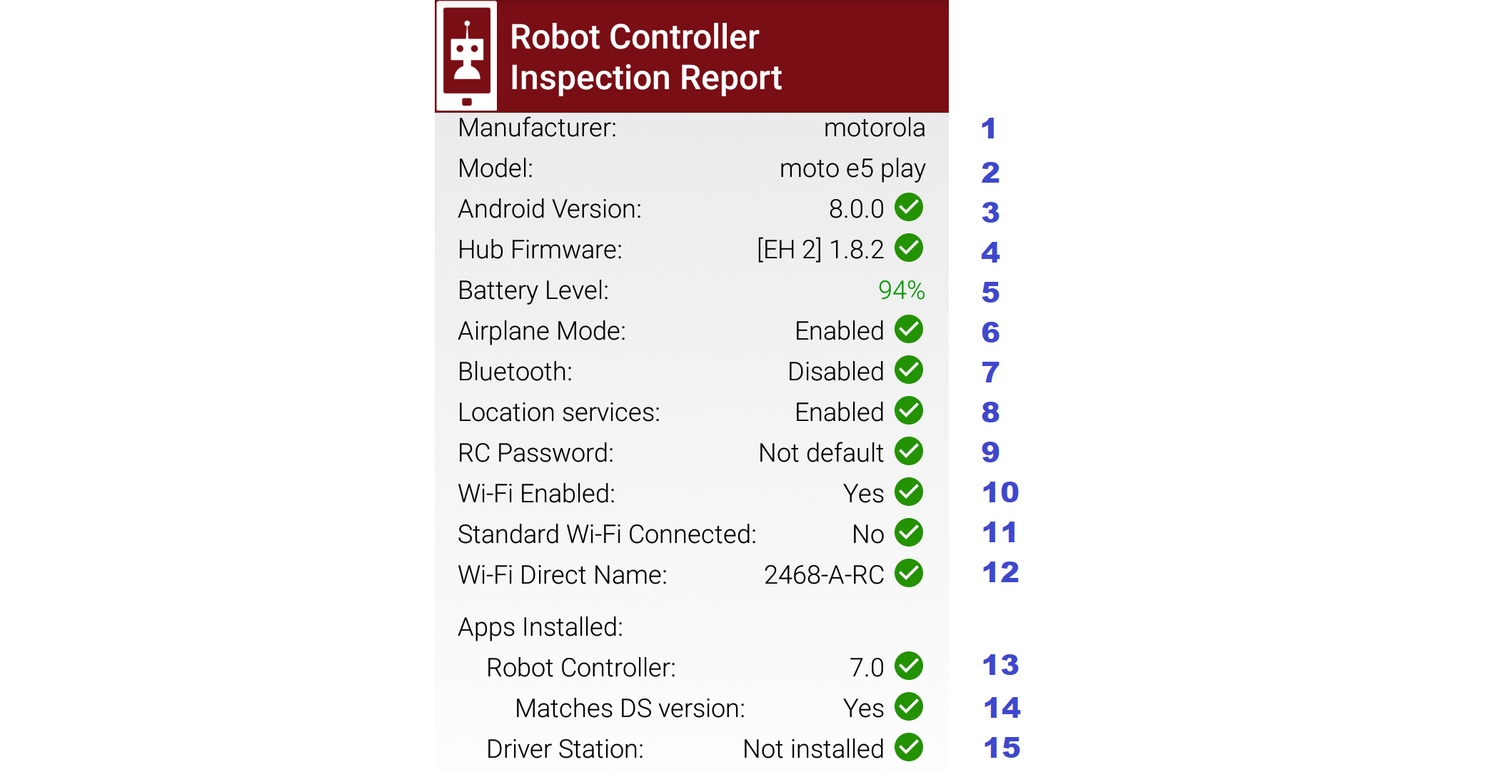Item 12 shows the Standard Wi-Fi network name, or Access Point (AP), that is broadcast by the Control Hub. The check-mark indicates the AP has a correctly formatted FTC name. This does not check that the DS and RC names match (team number). In fact, this DS phone is 2468-A-DS and this Control Hub is 9999-A-RC, an illegal combination to be flagged by the FTC team or the Robot Inspector.