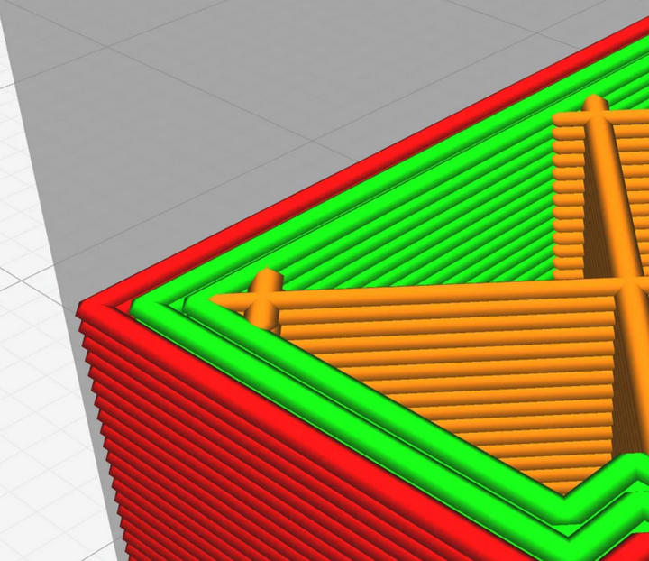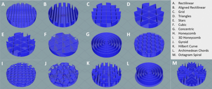 Infill is a measure of how solid your part is. This can vary based on desired strength. Infill patterns are the pattern taken by the percentage of infill that you specify. For Infill patterns it is recommended to use 3D infill patterns such as “Cubic” and “Gyroid”. 2D infill patterns such as “Grid” don’t have uniform stability in all directions.